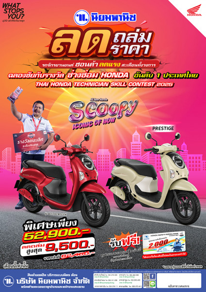 นิยมพานิช จัดโปรใหญ่ ฉลองชัย! รางวัลช่างซ่อมฮอนด้า อันดับ 1 ของประเทศ ทุบราคารถจักรยานยนต์ Honda Scoopy ใหม่ ลดสูงสุดถึง 9,500บาท