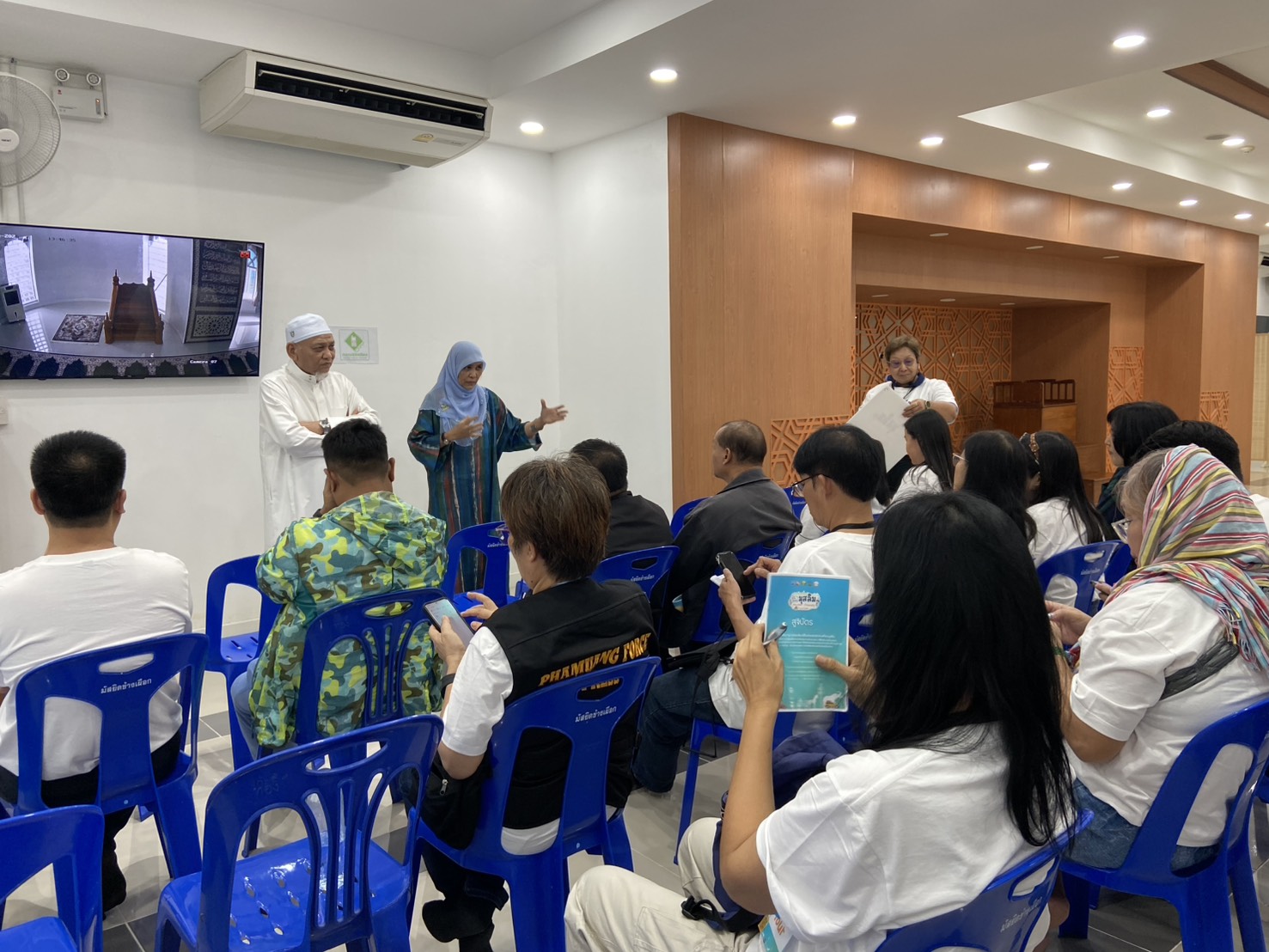 จากนั้นคณะเข้าเยี่ยมชมมัสยิดข้างเผือก มีอิมามมุตาฟา หะซัน หรือนายสรกิจ หะซัน ผู้ทรงคุณวุฒิจุฬาราชมนตรี ที่ปรึกษากรรมการอิสลามเชียงใหม่ ดูแล มัสยิดช้างเผือกแห่งนี้ สร้างขึ้นอย่างสวยงาม ใช้งบประมาณ กว่า 60 ล้านบาท ชาวมุสลิมทั่วโลกมาละหมาดที่แห่งนี้จำนวนมากเพราะห้องละหมาดจุคนได้มากกว่า 1,000 คน