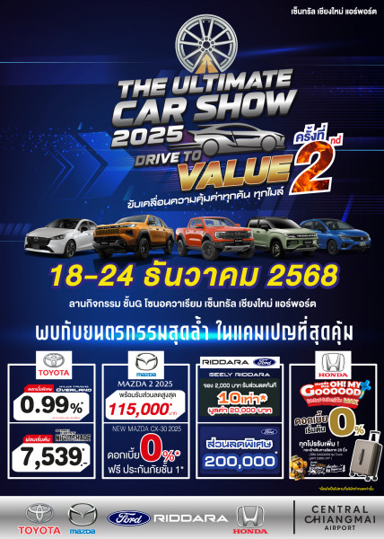 เตรียมพบกับที่สุดของงานแสดงรถยนต์แห่งปี! รับโปรพิเศษส่งท้ายปี The Ultimate Car Show 2025 : Drive to Value ครั้งที่ 2 ขับเคลื่อน ความคุ้มค่าทุกคัน ทุกไมล์ วันที่ 18 - 24 ธันวาคม 2568 ณ ลานกิจกรรม ชั้น G โซนอควาเรียม เซ็นทรัล เชียงใหม่ แอร์พอร์ต