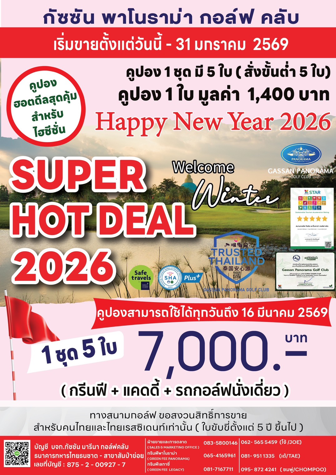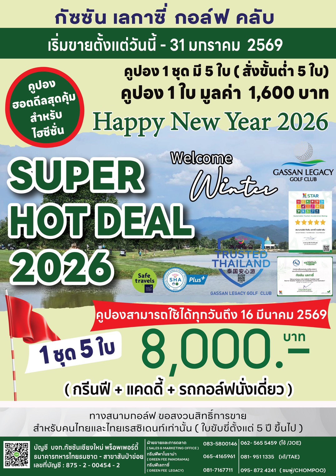 สนามกอล์ฟ "เครือกัซซัน" เปิดขายคูปองพิเศษ รายการ Super Hot Deal 2026 สำหรับคนไทย และไทยเรสซิเด้นท์ เพื่อการออกรอบเล่นกอล์ฟในช่วง "ไฮซีซั่น" ประจำปี 2569 จำหน่ายเป็นชุด 5 ใบ โดยคูปอง 1 ใบใช้สำหรับการออกรอบ 18 หลุม กับแพคเกจกรีนฟี แคดดี้ รถกอล์ฟ สนามกัซซันเลกาซี่ กอล์ฟคลับ จ.ลำพูน คูปองชุด 1 ชุด 5 ใบ ราคาชุดละ 8,000 บาท หรือเท่ากับราคาใบละ 1,600 บาท สนามกัซซันพาโนราม่า กอล์ฟคลับ จ.ลำพูน คูปอง 1 ชุด 5 ใบ ราคาชุดละ 7,000 บาท หรือเท่ากับใบละ 1,400 บาท เปิดจำหน่ายตั้งแต่วันนี้ - 31 มกราคม 2569 ซื้อแล้วใช้ได้ทันที ทุกวัน ทุกเวลา และสามารถใช้ได้จนถึงวันที่ 16 มีนาคม 2569 นอกจากนั้น ที่สนามกัซซันเลกาซี่ กอล์ฟคลับ และ สนามกัซซันพาโนราม่า กอล์ฟคลับ ยังมีโปรโมชั่นการออกรอบเล่นกอล์ฟ ที่พัก สถานที่จัดเลี้ยงหรือจัดประชุมสัมมนา รวมทั้งรายการอาหารเมนูพิเศษไว้บริการอีกมากมาย ผู้สนใจสามารถติดต่อสอบถามรายละเอียดเพิ่มเติม จองออกรอบหรือใช้บริการได้ที่ กัซซันเลกาซี่ กอล์ฟคลับ กรีนฟี โปรช็อป โทร.053-921846 และ 081-7167711 กัซซันพาโนราม่า กอล์ฟคลับ กรีนฟี โปรช็อป โทร.065-4165961 ฝ่ายขายและการตลาด โทร.053-921815, 083-5800146 หรือที่ Line ID : gassangolf