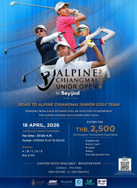อัลไพน์กอล์ฟรีสอร์ทเชียงใหม่ กำหนดจัดการแข่งขันกอล์ฟเยาวชน รายการ ALPINE CHIANGMAI JUNIOR OPEN 2026 by Beyond Fairways Asia Road to Alpine Chiangmai Junior Golf Team ในวันที่ 18 เมษายน 2569 เวลา 07.00 น. อัตราค่าสมัครคนละ 2,500 รวมกรีนฟี แคดดี้ รถกอล์ฟ อาหารและ Alpine Bucket hat