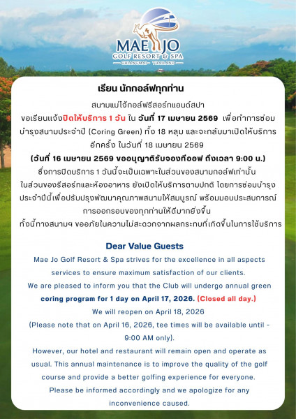 Mae Jo Golf Resort & Spa strives for the excellence in all aspects services to ensure maximum satisfaction of our clients. We are pleased to inform you that the Club will undergo annual green coring program for 1 day on April 17, 2026. (Closed all day.) We will reopen on April 18, 2026 (Please note that on April 16, 2026, tee times will be available until 9:00 AM only).