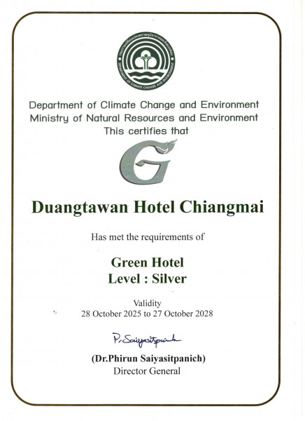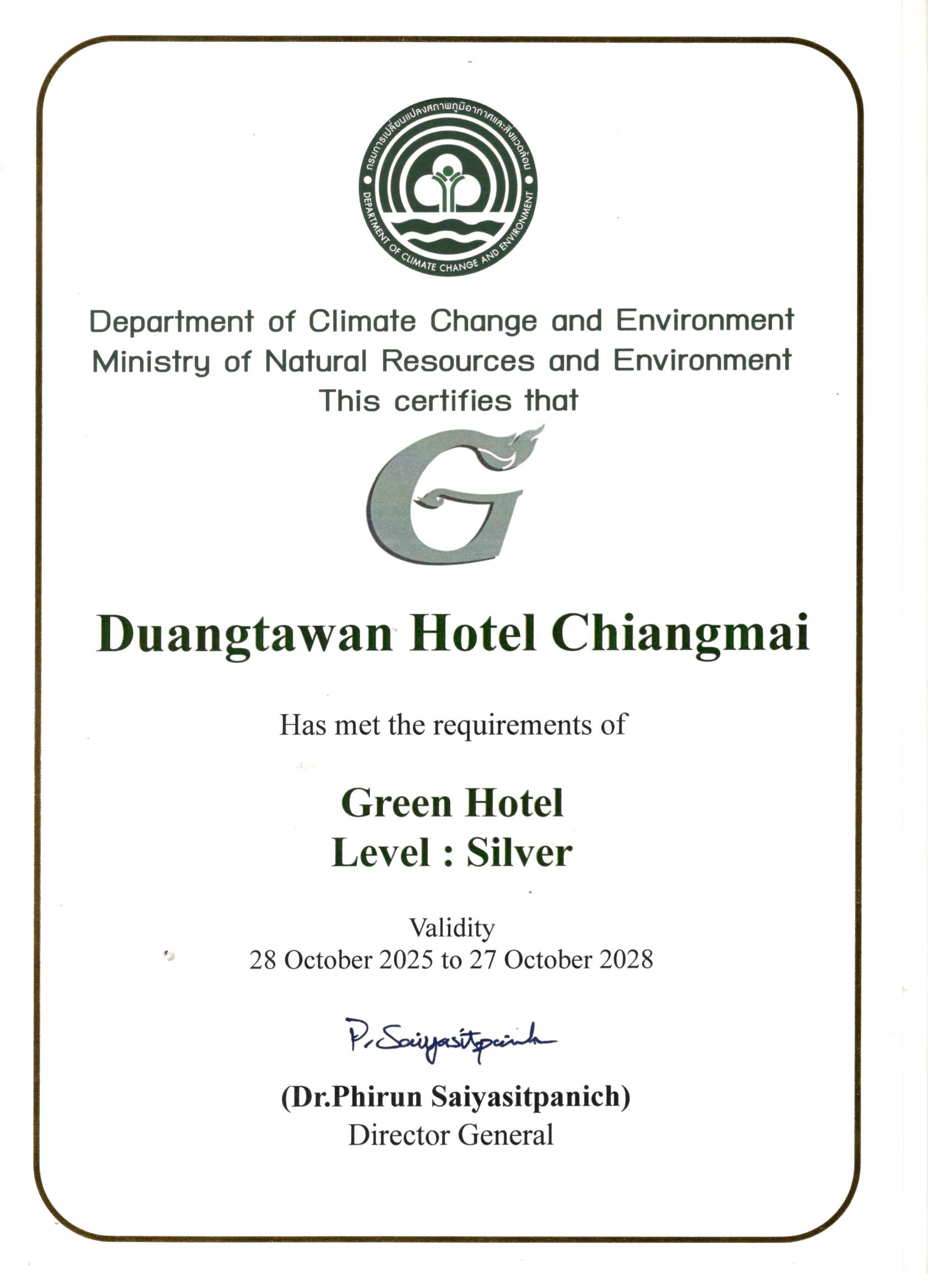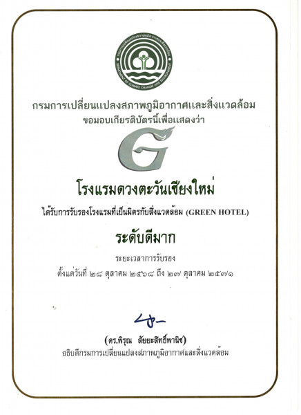 โรงแรมดวงตะวันเชียงใหม่ ตอกยำ้จุดยืนของการเป็นผู้นำด้านการบริการที่เป็นมิตรต่อสิ่งแวดล้อมอีกครั้ง ด้วยการคว้า รางวัล Green Hotel (โรงแรมที่เป็นมิตรกับสิ่งแวดล้อม) ระดับดีมาก (G-Gold) ต่อเนื่องเป็นครั้งที่ 3 รวมระยะเวลา 10 ปี รางวัลนี้ไม่ใช่เพียงเครื่องหมายการันตีความสำเร็จ แต่เป็นประจักษ์พยานถึงความมุ่งมั่นและความเพียรพยายามในการดูแล "บ้าน" และ "โลก" ของเราอย่างยั่งยืน พร้อมก้าวต่อไปสู่ High Value and Sustainable Tourism