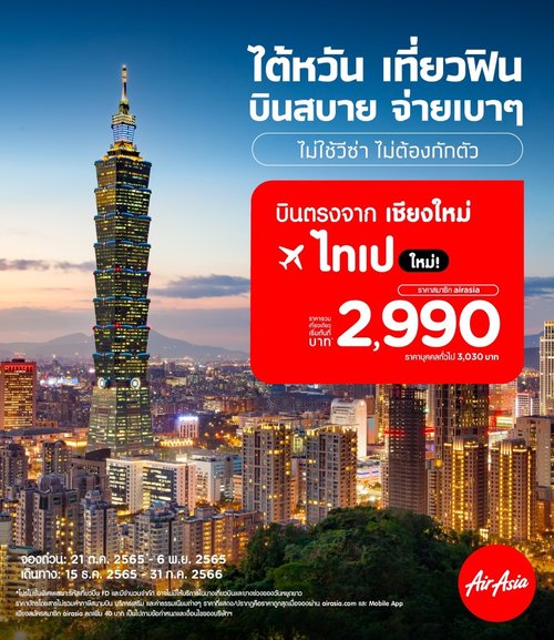 ในโอกาสเปิดเส้นทางบินใหม่ เชียงใหม่ สู่ ไต้หวัน(ไทเป) 3 เที่ยวบินต่อสัปดาห์ ทุกวันอังคาร พฤหัสบดี เเละเสาร์ พร้อมฉลองความภูมิใจ ที่ทุกคนร่วมผลักดันให้แอร์เอเชีย ได้รับรางวัล “สายการบินราคาประหยัดที่ดีที่สุดในโลก 13 สมัย” จากการจัดอันดับของสกายเเทรกซ์ จึงจัดโปรโมชั่นบินคุ้ม “เชียงใหม่-ไทเป” ราคาสมาชิก เริ่มต้นที่ 2,990 บาท ต่อเที่ยว สำรองที่นั่งได้ตั้งเเต่ 21 ตุลาคม-6 พฤศจิกายน 2565 เพื่อเดินทางได้ตั้งเเต่ 15 ธันวาคม 2565-30 มิถุนายน 2566 สำรองที่นั่งได้เลยที่ airasia Super App