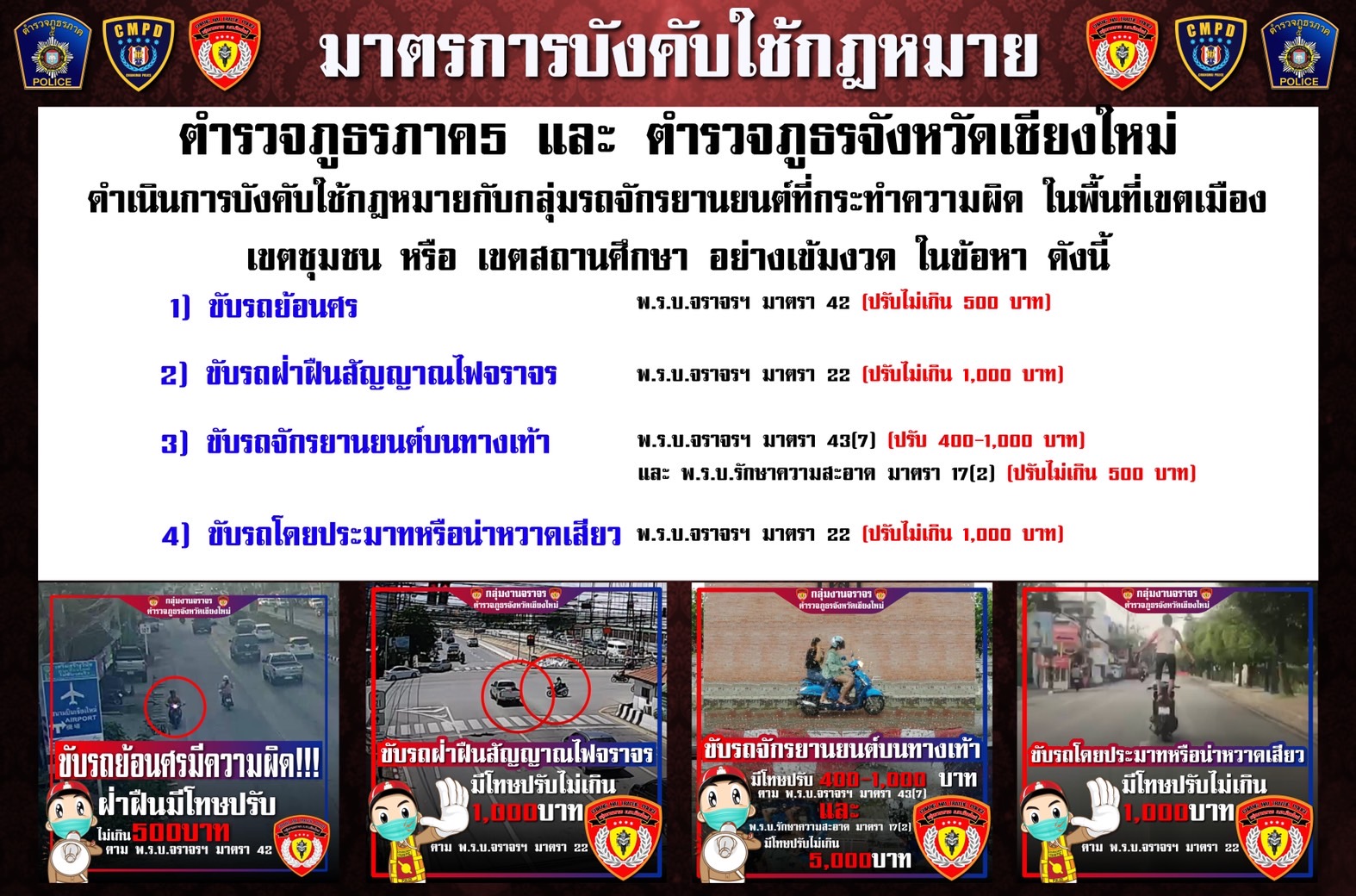ตำรวจภูธรภาค 5 และตำรวจภูธรจังหวัดเชียงใหม่ มอบหมายให้ กลุ่มงานจราจรตำรวจภูธรจังหวัดเชียงใหม่ ดำเนินการตามมาตรการความปลอดภัยเพื่อป้องกันการเกิดอุบัติเหตุเริ่มวันที่ 1 5พฤศจิกายน 2564 เป็นต้นไป  เรื่องมาตรการบังคับใช้กฎหมายสำนักงานตำรวจแห่งชาติจะบังคับใช้กฎหมายกับกลุ่มรถจักรยานยนต์ที่กระทำผิด ในพื้นที่เขตเมืองเขตชุมชน หรือเขตสถานศึกษา อย่างเข้มงวด ซึ่งเป็นสาเหตุสำคัญของการเกิดอุบัติเหตุในข้อหา ดังนี้