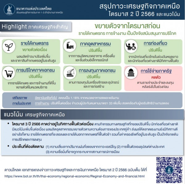 วันนี้ (3 ส.ค. 66) ที่ ห้องประชุมธนาคารแห่งประเทศไทย สำนักงานภาคเหนือ นางพรวิภา ตั้งเจริญมั่นคง ผู้อำนวยการอาวุโส ธนาคารแห่งประเทศไทย สำนักงานภาคเหนือ  เปิดเผยถึงภาวะเศรษฐกิจและการเงินภาคเหนือ ไตรมาส 2 ปี 2566 ว่าปรับตัวดีขึ้นจากไตรมาสก่อน รายได้เกษตรกรขยายตัวจากด้านผลผลิตเป็นสำคัญ ขณะที่ราคายังอยู่ในระดับสูง ผลผลิตอุตสาหกรรมปรับดีขึ้นตามการผลิตในหมวดอาหาร เครื่องดื่ม และชิ้นส่วนรถยนต์ การท่องเที่ยวปรับดีขึ้นโดยเฉพาะรายได้จากนักท่องเที่ยวต่างชาติ รวมทั้งตลาดแรงงานปรับดีขึ้นต่อเนื่อง ช่วยให้การบริโภคและการลงทุนปรับตัวดีขึ้น ส่วนอัตราเงินเฟ้อทั่วไปปรับลดลงจากไตรมาสก่อน จากหมวดอาหารสดและพลังงาน เช่นเดียวกับอัตราเงินเฟ้อพื้นฐานที่ปรับลดลง