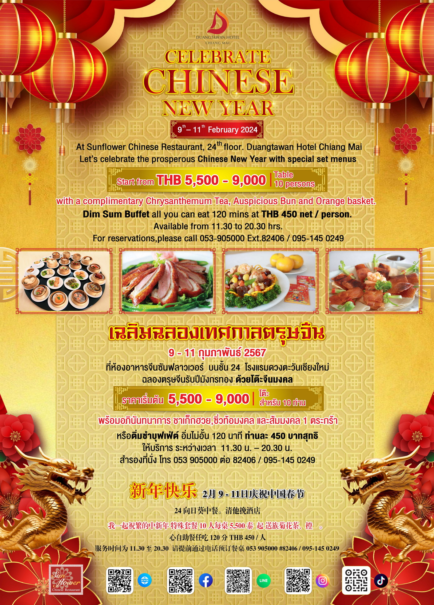 ขอเชิญชวนพี่น้องเชื้อสายจีนทุกท่านร่วมเฉลิมฉลองเทศกาลตรุษจีน ที่ห้องอาหารจีนซันฟลาวเวอร์ บนชั้น 24 โรงแรมดวงตะวัน เชียงใหม่ พร้อมเสิร์ฟอาหารจีนชุดพิเศษและอาหารมงคล ให้ท่านได้เฉลิมฉลอง เพื่อความเป็นสิริมงคลรับปีมังกรทอง จัดเมนูโต๊ะจีนชุดเสริมโชคลาภ สุขภาพดี ราคาเริ่มต้นที่ โต๊ะละ 5,500 บาทสุทธิ เชิญเลือกตามชอบใจเริ่มต้นที่ “ชุดพลังแห่งชีวิต” ราคาโต๊ะละ 5,500 บาทสุทธิ ประกอบด้วย กระดาษห่อกุ้งทอดกับลูกชิ้นกุ้งทอดวาซาบิ , ซุปเป๋าฮื้อทะเลทรงเครื่อง , เป็ดย่างฮ่องกง, เนื้อผัดคะน้าฮ่องกงน้ำมันหอย, กังป๋วยราดผักสามสหาย, ปลากะพงนึ่งบ๊วย, ก๋วยเตี๋ยวเส้นใหญ่ราดหน้าทะเล และ สามแซ่