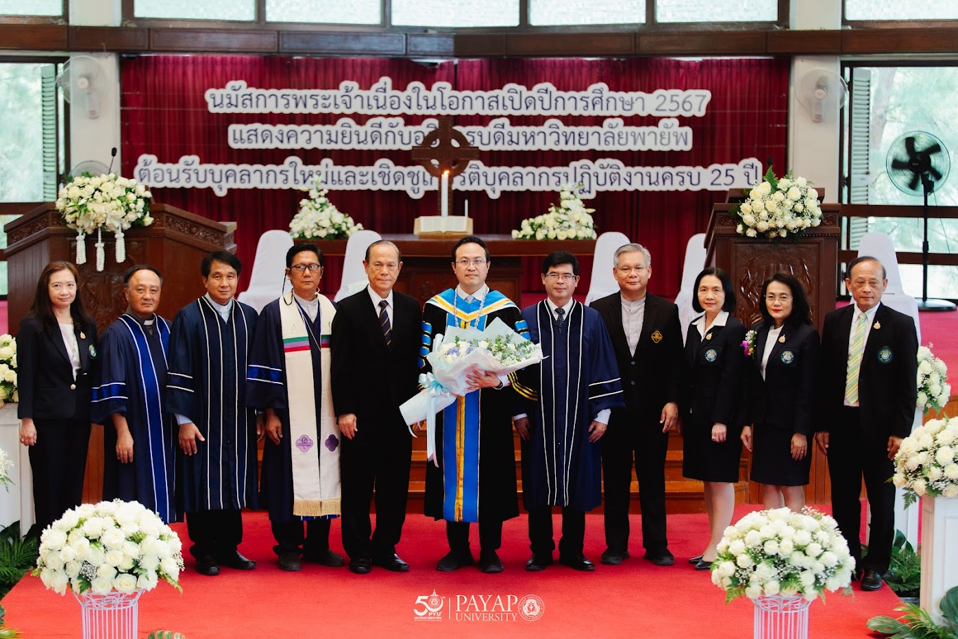 มหาวิทยาลัยพายัพ จัดพิธีนมัสการพระเจ้าเนื่องในโอกาสเปิดปีการศึกษา 2567 พร้อมแสดงความยินดีกับอธิการบดี ต้อนรับบุคลากรใหม่ และพิธีเชิดชูเกียรติบุคลากรปฏิบัติงานครบ 25 ปี เมื่อวันที่ 3 กรกฎาคม 2567 ณ โบสถ์เฮ็นรี ลูซ มหาวิทยาลัยพายัพ เขตแม่คาว