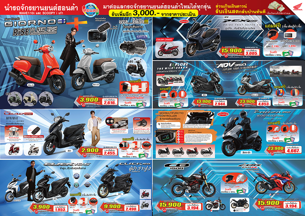 โปรแรงส์รับความสดใส ถูกใจคนรุ่นใหม่  All New Honda  Scoopy ดีไซน์ใหม่รอบคัน ตอกย้ำความเป็นเอกลักษณ์แบบ Scoopy ...เพียง 2,900 บาท ก็ออก Scoopy ใหม่ได้ แบบไม่มีจ่ายเพิ่ม ฟรี ทะเบียน พรบ. ซื้อผ่อน 1ปี ขึ้นไปรับฟรีประกันรถหาย พร้อมรับของแถมพิเศษ รวมมูลค่า 6,490 บาท