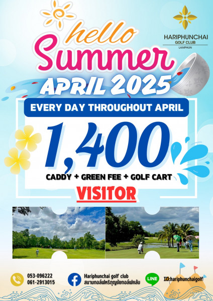 สนามกอล์ฟหริภุญชัยกอล์ฟคลับประชาสัมพันธ์โปรโมชั่นให้ท่านนักกอล์ฟ ตลอดเดือนเมษายนราคาคนไทย 900 ไทยเรสซิเด้นส์ 1,100 ต่างชาติ 1,400 สำหรับวันจันทร์และวันพฤหัสบดี Sport day ทั้งวันราคา  800 บาท โปรโมชั่นสำหรับคนไทยเท่านั้นและวันอังคารและวันพุธ Good morning ออกรอบก่อน 10 โมง 800 บาท ออกรอบหลัง 10 โมง 900 บาท สอบถามรายละเอียดเพิ่มเติมได้ที่  053-096222 , 061-291-3015 Line ID : 0612913015 FB:สนามกอล์ฟหริภุญชัย กอล์ฟคลับ
