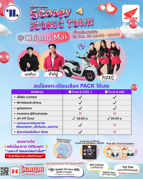 Scoopy Iconic Town @Chiang Mai รวมพลังสายแฟ สายไอคอนิค กับกิจกรรมสุดเทรนด์แห่งปี! พบกันวันที่ 29 มิถุนายน 2568 เวลา 14:00-20:00 น. ณ เซ็นทรัลเฟสติวัล เชียงใหม่ พบกับความสนุกสุดปังที่คุณห้ามพลาด! ไม่ว่าจะเป็นมินิคอนเสิร์ต จากศิลปินสุดฮอต "ออฟโรด - ต้าห์อู๋ - PiXXiE" โซนแฟชั่นสุดคูล