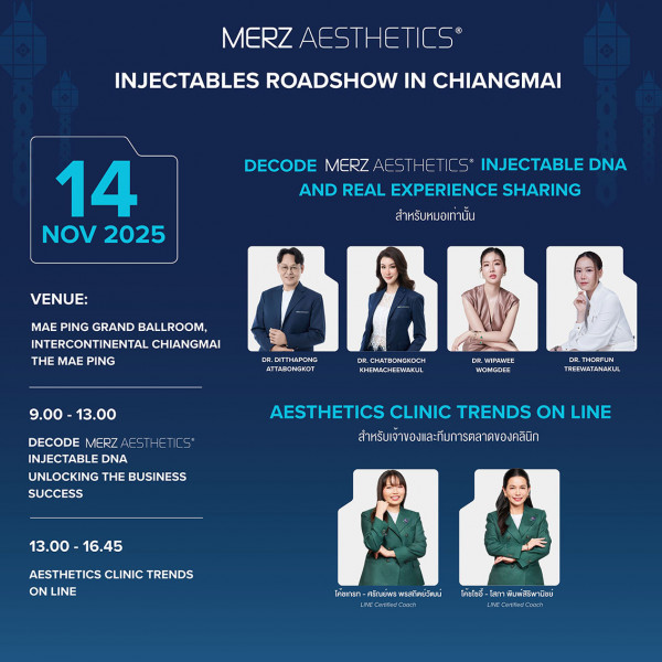 Merz Aesthetics ได้เชิญแพทย์และผู้ประกอบการคลินิกความงามในพื้นที่ ภาคเหนือ และภาคกลาง (พิษณุโลก, ลพบุรี และจังหวัดใกล้เคียง) มาร่วมถอดรหัส ปลดล็อกองค์ความรู้เชิงการแพทย์ พร้อมยกระดับ ศักยภาพการให้บริการและการบริหารคลินิกไปพร้อมกับผู้เชี่ยวชาญจาก Merz Aesthetics สัมผัสแนวคิดและ มุมมองใหม่ในการออกแบบผลลัพธ์การรักษาที่ ปลอดภัย เป็นธรรมชาติ และตอบโจทย์คนไข้เฉพาะบุคคล โดยสามารถเข้าร่วมได้ทั้งรูปแบบ Online และ Onsite งานดังกล่าวจัดขึ้นแบบ Onsite : ในวันศุกร์ที่ 14 พฤศจิกายน 2568 เวลา 09.00-13.00 น. ณ โรงแรมอินเตอร์คอนติเนนตัล เชียงใหม่ และ Online: รับชมผ่านระบบ Zoom โดยถ่ายทอดสด ในวัน-เวลา เดียวกันกับ Onsite Merz Aesthetics "ปลดล็อกศักยภาพธุรกิจ พร้อมสร้างมาตรฐานใหม่ของวงการความงาม Safety First, Confidence Always"