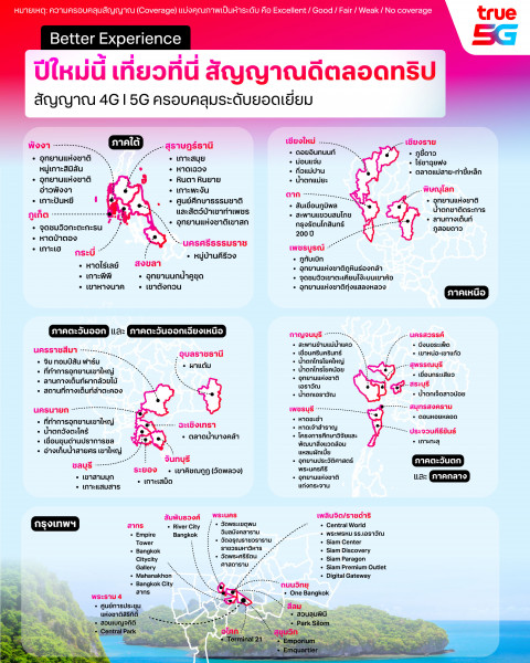 โครงข่าย 5G และ 4G ของทรู คอร์ปอเรชั่นได้รับการพัฒนาให้ครอบคลุมในระดับคุณภาพสูงในแหล่งท่องเที่ยวสำคัญทั่วประเทศ รองรับการเดินทางและการใช้งานในช่วงเทศกาลปีใหม่อย่างต่อเนื่อง ทั้งพื้นที่ธรรมชาติ เมืองท่องเที่ยวหลัก ศูนย์กลางเศรษฐกิจ และแลนด์มาร์กระดับประเทศ