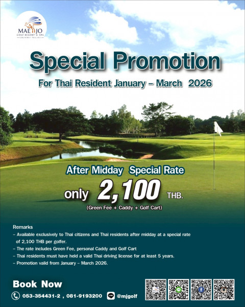 สนามกอล์ฟ แม่โจ้กอล์ฟรีสอร์ทแอนด์สปา จ.เชียงใหม่ กำหนดจัดโปรโมชั่นการออกรอบเล่นกอล์ฟในช่วงฤดูการท่องเที่ยว "ไฮซีซั่น" ประจำปี 2569 ระหว่างวันที่ 1 มกราคม - 31 มีนาคม 2569 สำหรับการออกรอบ 18 หลุม หลังเวลา 12.00 น. ทุกวัน กับแพคเกจรวมกรีนฟี แคดดี้ รถกอล์ฟ ในราคาคนละ 2,100 บาท โดยมีเงื่อนไขประกอบด้วย สำหรับคนไทยและไทยเรสิเดนท์เท่านั้น ไทยเรสิเดนท์ต้องมีใบอนุญาตขับขี่ 5 ปีขึ้นไป เริ่มต้นการออกรอบหลังเวลา 12.00 น. ทุกวัน ราคาพิเศษ คนละ 2,100 บาท รวมกรีนฟี แคดดี้ รถกอล์ฟโปรโมชั่นนี้ใช้ได้ระหว่างเดือนมกราคม - มีนาคม 2569 ผู้สนใจสามารถติดต่อสอบถามรายละเอียดและจองเวลาออกรอบได้ที่ โทรศัพท์ 053-354431–2, 081-919-3200 หรือที่  LINE: @mjgolf  รวมทั้งสามารถเข้าไปดูรายละเอียดต่าง ๆ เพิ่มเติมได้ทางเว็บไซต์ www.maejogolfclub.com