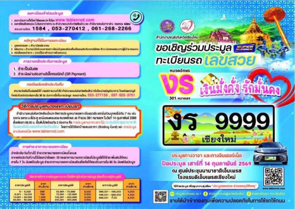 เลขสวยมาแล้ว ขนส่งฯ เชียงใหม่ เปิดประมูลป้ายทะเบียนรถ งร ความหมาย สุดว้าว! “เงินมั่งคั่ง รักมั่นคง” รับเดือนแห่งความรัก