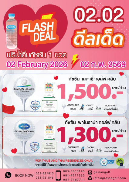 Flash Deal 02.02 ดีลเด็ดสุดคุ้ม ในวันที่ 2 กุมภาพันธ์ 2569 ทุกเวลาเพียงวันเดียวเท่านั้น สนามกัซซันเลกาซี่ กอล์ฟคลับ ราคาคนละ 1,500 บาท สนามกัซซันพาโนราม่า กอล์ฟคลับ ราคาคนละ 1,300 บาท กับแพคเกจการออกรอบ 18 หลุม รวมกรีนฟี แคดดี้ รถกอล์ฟ พร้อมแถมฟรี น้ำดื่มกัซซัน 1 ขวด เฉพาะคนไทยและไทยเรสิเดนท์เท่านั้นและนักกอล์ฟที่สนใจ