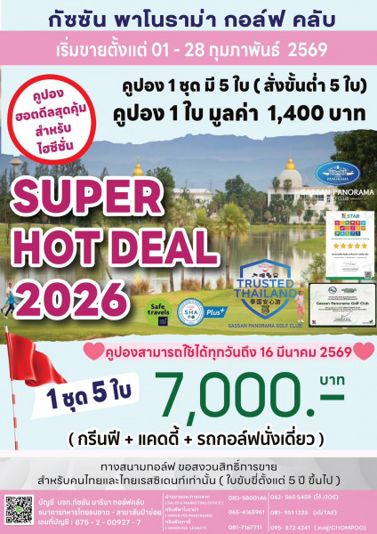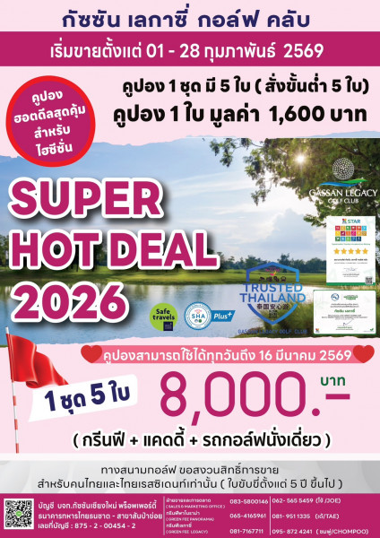 คูปองฮอตดีลสุดคุ้ม Super Hot Deal Coupon 2026 คูปองชุดราคาพิเศษ ชุดละ 5 ใบ โดยคูปอง 1 ใบ ใช้สำหรับออกรอบ 18 หลุม รวมกรีนฟี แคดดี้ รถกอล์ฟ สนามกัซซันเลกาซี่ กอล์ฟคลับ ราคาชุดละ 8,000 บาท หรือเท่ากับใบละ 1,600 บาท สนามกัซซันพาโนราม่า กอล์ฟคลับ ราคาชุดละ 7,000 บาท หรือเท่ากับใบละ 1,400 บาท เปิดขายระหว่างวันที่ 1 - 28 กุมภาพันธ์ 2569 และสามารถใช้ได้ถึงวันที่ 16 มีนาคม 2569 เฉพาะคนไทยและไทยเรสิเดนท์เท่านั้นสามารถติดต่อสอบถามรายละเอียดเพิ่มเติม จองออกรอบหรือใช้บริการได้ที่ กัซซันเลกาซี่ กอล์ฟคลับ กรีนฟี โปรช็อป โทร.053-921846 และ 081-7167711 กัซซันพาโนราม่า กอล์ฟคลับ กรีนฟี โปรช็อป โทร.065-4165961 ฝ่ายขายและการตลาด โทร.053-921815, 083-5800146 หรือที่ Line ID : gassangolf