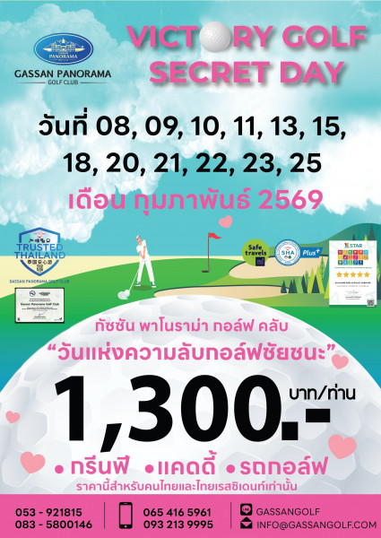 สนามกอล์ฟ "เครือกัซซัน" ซึ่งประกอบด้วย สนามกัซซันเลกาซี่ กอล์ฟคลับ และ สนามกัซซันพาโนราม่า กอล์ฟคลับ จ.ลำพูน จัดให้อีกแล้วสำหรับโปรโมชั่นการออกรอบเล่นกอล์ฟในราคาถูกเป็นพิเศษ รายการ Victory Golf Secret Day วันแห่งความลับกอล์ฟชัยชนะ ต้อนรับเดือนแห่งความรัก สำหรับเดือนกุมภาพันธ์ 2569 ดังนี้