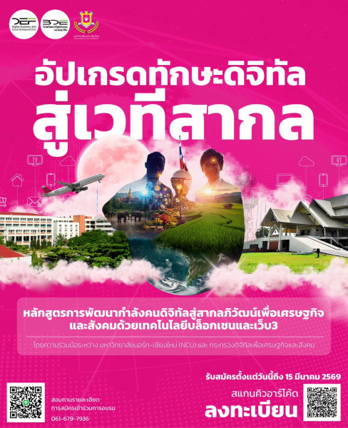 มหาวิทยาลัยนอร์ท-เชียงใหม่ (NCU) ร่วมกับกระทรวงดิจิทัลเพื่อเศรษฐกิจและสังคม ขอเชิญชวนผู้ประกอบการ บุคลากรในภาคอุตสาหกรรม ภาคธุรกิจ รวมถึงผู้ที่สนใจด้านเทคโนโลยีดิจิทัล สมัครเข้าร่วม โครงการอบรมเชิงปฏิบัติการ “ยกระดับศักยภาพกำลังคนดิจิทัลสู่สากลด้วยเทคโนโลยี Blockchain และ Web 3” เพื่อพัฒนาทักษะดิจิทัลและเตรียมความพร้อมสู่เศรษฐกิจยุคใหม่