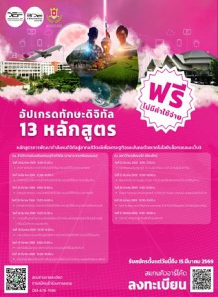 • ผู้สนใจพัฒนาทักษะด้านดิจิทัลและเทคโนโลยีสมัยใหม่ (Advanced Digital Skills & Technology) การอบรมจะจัดขึ้นระหว่างวันที่ 24 – 27 มีนาคม 2569 ณ สำนักงานส่งเสริมเศรษฐกิจดิจิทัล (สาขาภาคเหนือตอนบน) และ มหาวิทยาลัยนอร์ท-เชียงใหม่