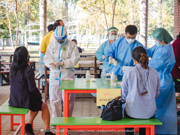 วันจันทร์ที่ 10 มกราคม 2565 คณะผู้บริหารมหาวิทยาลัยแม่โจ้ นำทีมบุคลากรของมหาวิทยาลัย ดำเนินตามมาตรการสาธารณสุขเพื่อป้องกันและควบคุมการแพร่ระบาดของ COVID-19 ช่วงหลังเทศกาลปีใหม่ โดยการตรวจเชิงรุกบุคลากรทุกคนที่มาปฏิบัติงานในพื้นที่ เป็นครั้งที่ 2  หลังจากได้ทำการตรวจครั้งแรกเมื่อวันที่ 4 มกราคม 2564 ที่ผ่านมา พร้อมทั้งให้กำลังใจแก่ทีมงาน เจ้าหน้าที่ บุคลากร และเน้นย้ำถึงการปฏิบัติตามมาตรการอย่างเคร่งครัด ณ จุดตรวจ ATK งานอนามัยและพยาบาล อาคารอำนวย ยศสุข โดยมีทีมคณะพยาบาลศาสตร์ เป็นผู้ดำเนินการตรวจให้ ณ อาคารคณะวิศวกรรมและอุตสาหกรรมเกษตร มหาวิทยาลัยแม่โจ้